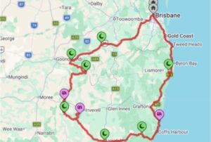 Overview of Tagalong: A trip from Yelarbon into New South Wales rolls through the quiet border town of Texas before opening into the farming country around Warialda and Bingara. Copeton Dam adds a sweep of blue before the road climbs towards Armidale’s Tablelands. From there, the route winds through Dorrigo’s lush rainforest and descends to the coast at Arrawarra. The final stretch north leads through beach towns and hinterland hills, ending in the green, subtropical calm of Alstonville.